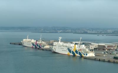フェリーは1階、2階とも簡単なベンチ。寒かったので到着ちょっと前に上のデッキへ出て写真撮影しました。