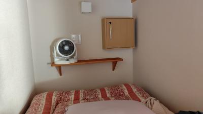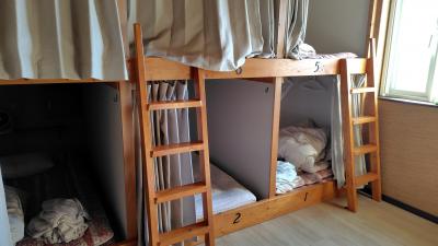 女性専用6人部屋に宿泊しました。部屋の半分が3列×2段の棚になっていて、前面のカーテンを引けばプライバシーが守られます。泊まった時はちょうどいい気温だったので、個別のスペースに置いてあった扇風機を使いませんでしたが、今年の夏の暑さだと中の扇風機使ってカーテン開ける必要があったと思います。