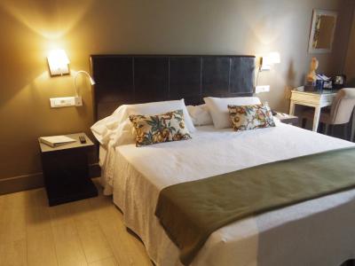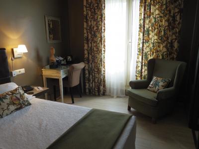 お部屋はたぶんここが一番上のランクなので、まあまあ広さはあります。ベッドはシングルを2つくっつけて半端なダブルベッドになっています。(シーツ、カバーはダブル用)。部屋にはスペインには珍しく湯沸かしポットがあり、無料の水2本、インスタントコーヒーと紅茶が置いてありましたが、ミニバー(冷蔵庫)がなかったのは残念でした。