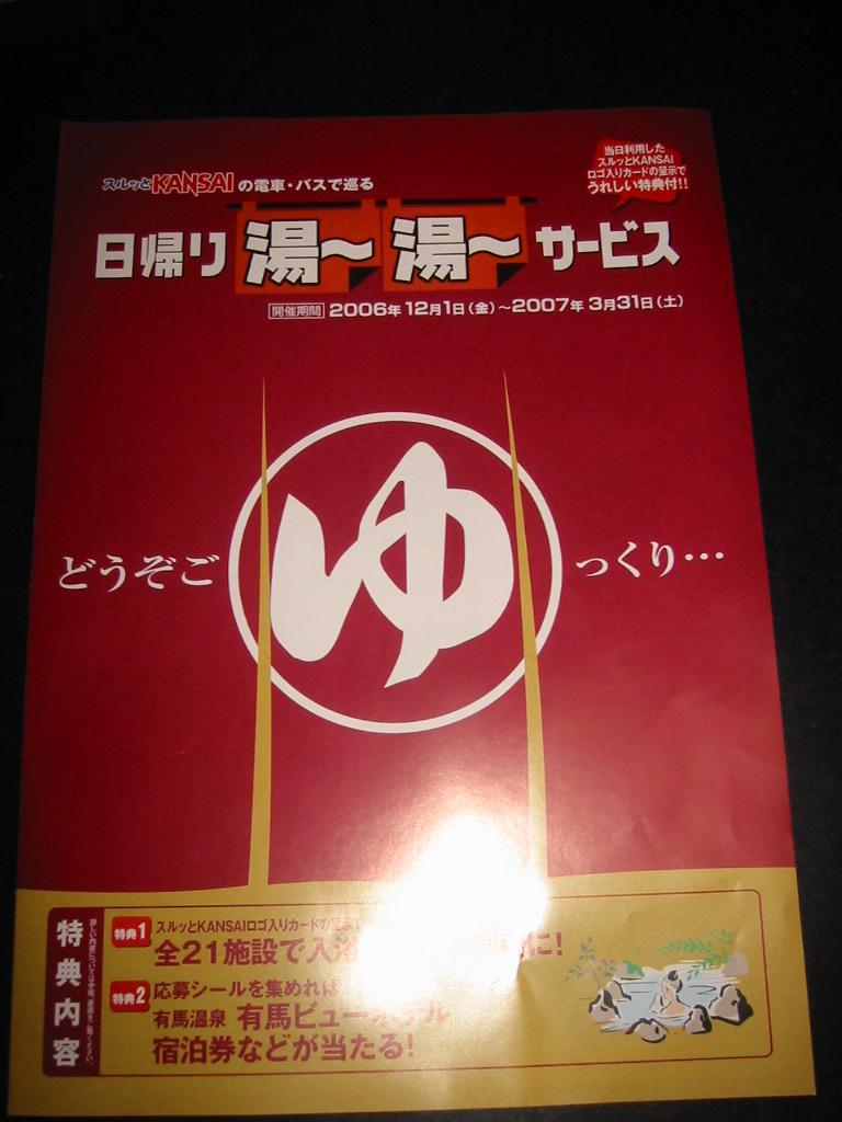 日帰り湯~湯~サービス、期間は12月1日~来年3月31日まで。当日利用したスルッとKANSAIロゴ入りカードの提示で、全21施設で入浴料などが割引に、応募シールを集めれば、有馬温泉 有馬ビューホテルの宿泊券などが当たる特典も。大阪・兵庫・京都・奈良・三重まで割引特典は施設によって違うのですが、スルッとKANSAIカードは地下鉄・バスなどで利用できる便利なカードなので、使って割引もしてもらえばなおお得。