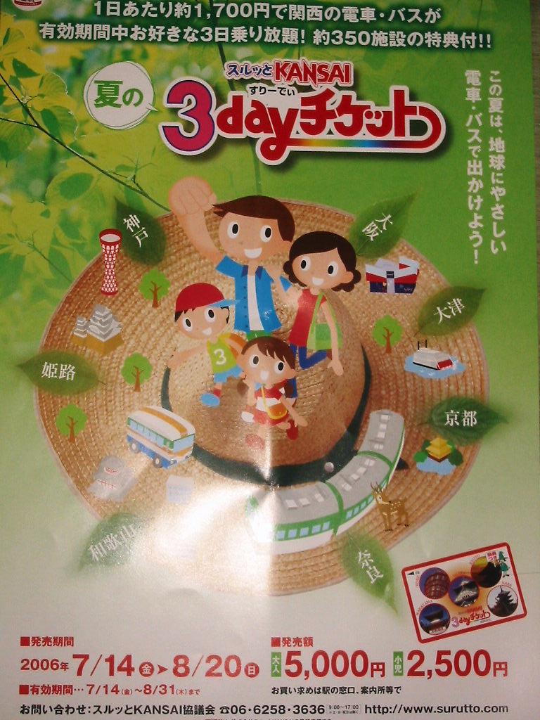 スルっとKANSAI3daチケットは好きな3日間(飛び飛び利用OK)地下鉄や各私鉄と関西主要な電車、バスに乗り放題大人5千円子供千円。発売期間は7月14日から8月20、有効期限7月14日~8月31日までhttp://.surutto.com/夏休みに関西にこられる方は本当に便利なチケットです。連続ではなくて使えるので、私もよく利用しています。春・夏・冬と発売されるのでお得なチケットカードだと思います。主要な駅、売店で売られています。施設の割引や特典もありますので、ぜひ利用してみてください。