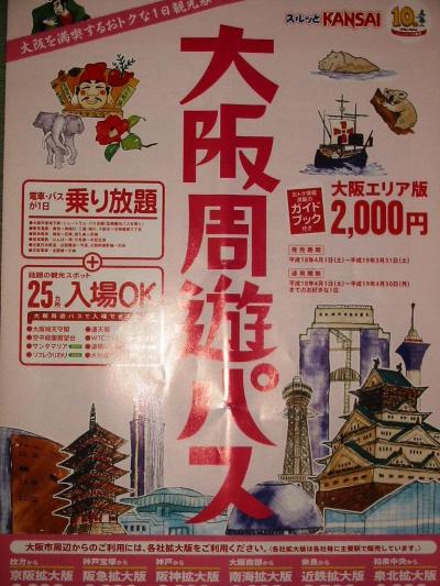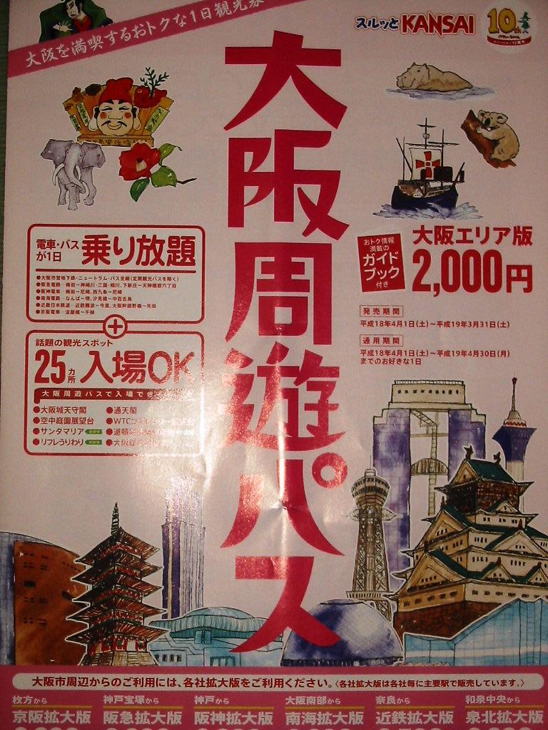 大阪周遊パス、バス・電車が1日載り放題、発売期間18年4・1日~19年3・31通用期間18年4・1~19年4・30間でのお好きな1日。+話題の観光スポット25ヶ所入場OK大阪エリア版2000円お得な情報満載ガイドブックつき。大阪地下鉄ニュートラム、バス全線。阪急電車・・梅田~神崎川・三国・相川、下新庄~天神橋筋六丁目 阪神電車・・梅田~尼崎、西九条~尼崎 南海電車・・なんば~堺、汐見橋~中百舌鳥 近畿日本鉄道・・近鉄難波~今里、大阪阿部野橋~矢田 京阪電車・・淀屋橋~千林。販売は各列車の最寄の駅で売られているそうです。大阪をおおいに楽しんでください。