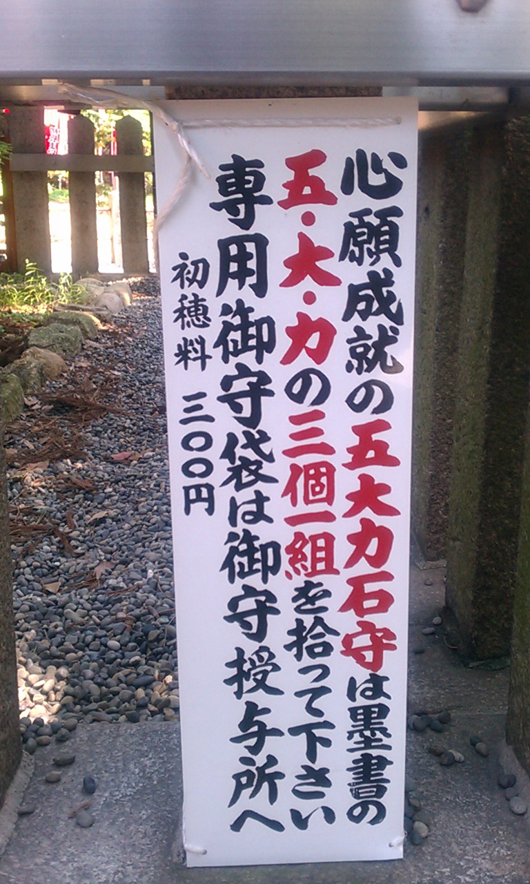 住吉大社の奥、初辰さん詣りにいったなら、五大力のお石を御守りに。五、大、力と書かれた石を自分で探して御守りに。