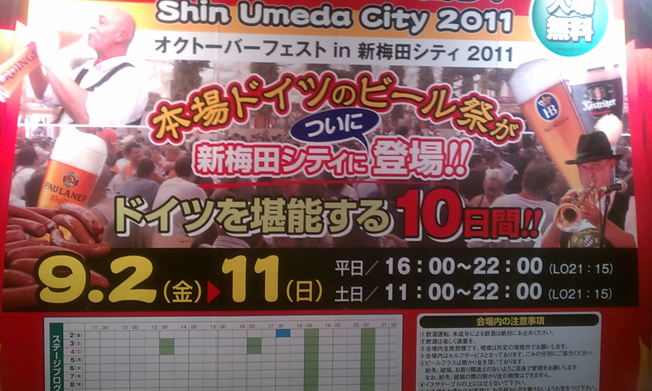 9月2日~9月11日まで、新梅田シティで開催中のドイツビール祭り。本場のビールとソーセージなどが、気軽にたのしめるので大変な賑わいです。