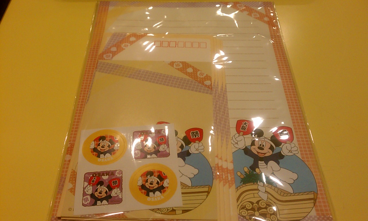 ちょうど地方の友達に手紙を書くのに、たまには可愛いミッキーのレターセットで、手紙を書きたくなり買いました。便箋10枚・封筒4枚・シールに、ポストカードがついて530円で、郵便局で販売しています。