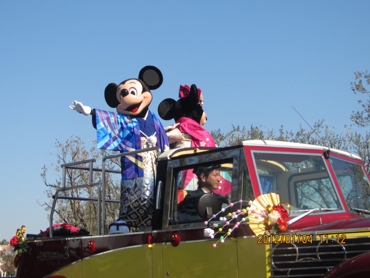 日本のお正月らしく、牛車とかが良かったですが、ミッキーとミニーは車に乗って現れました。