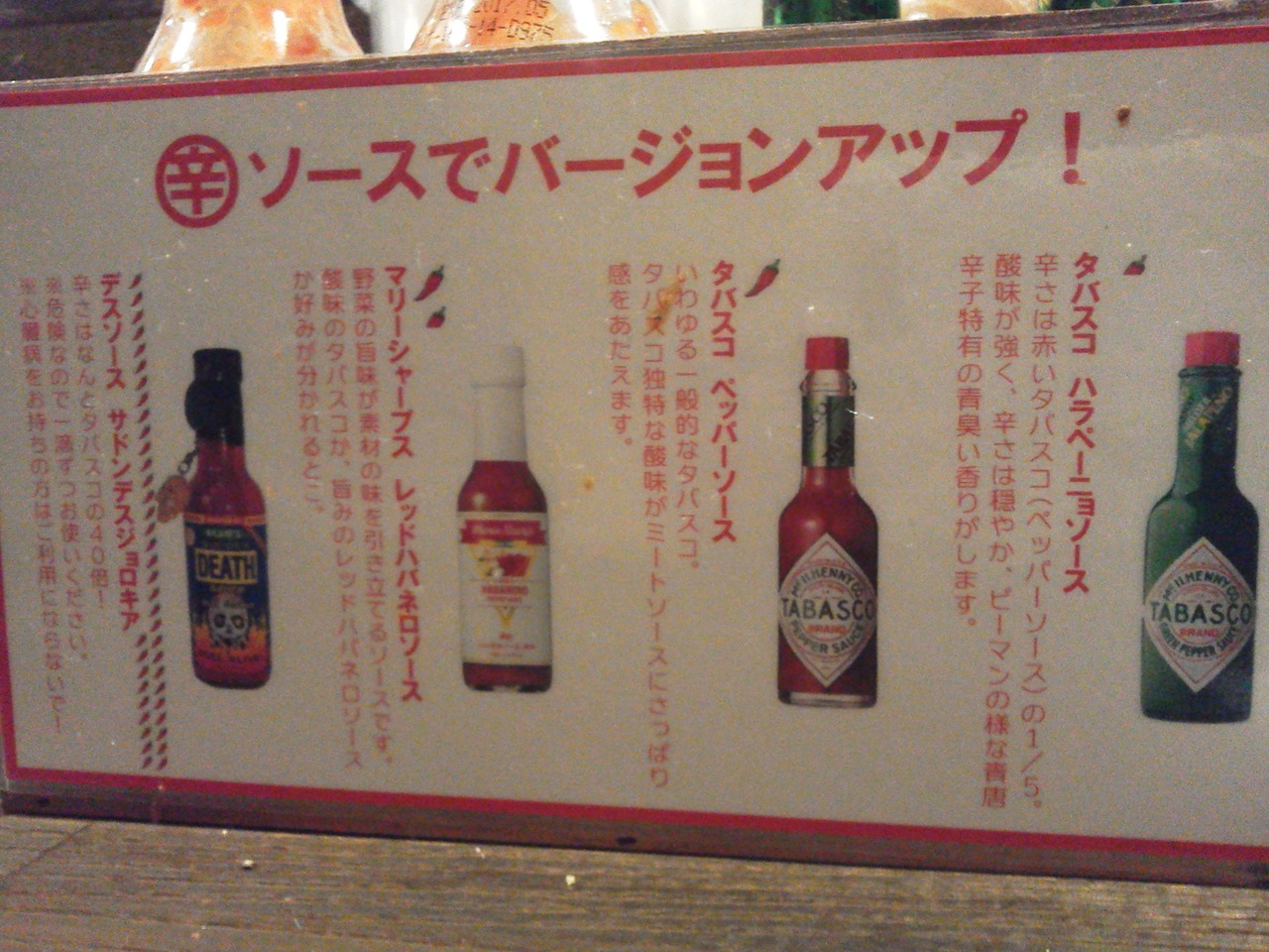 スパイシーソースが四種類に増えてました。サドンデスジョロキアを試す勇気はありませんでした。- 旅行時期