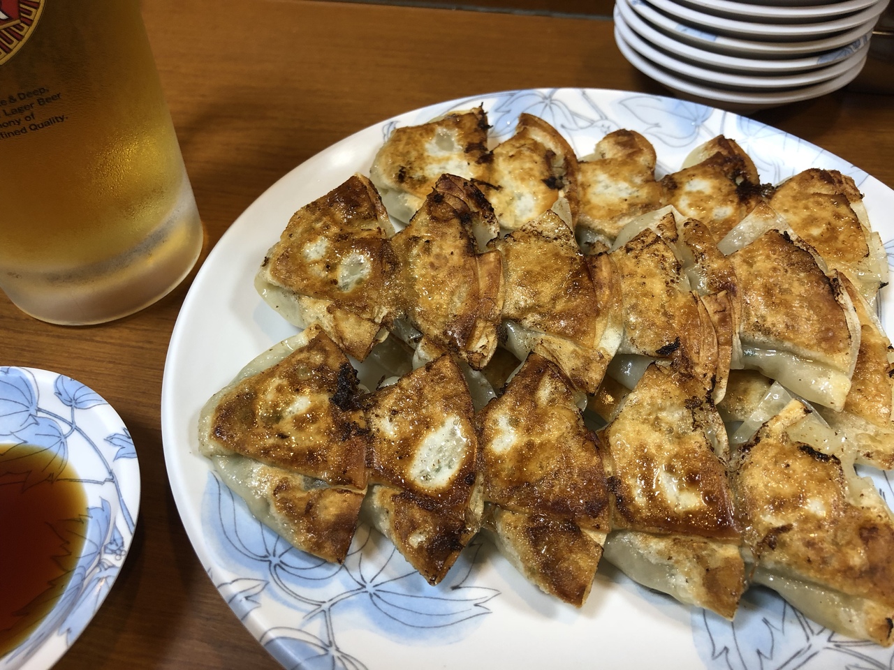 餃子2人前と生ビールをオーダーしました。餃子は一口サイズでカリッとして、具にも程よく味がついていて、わたし的に上位の餃子でした。