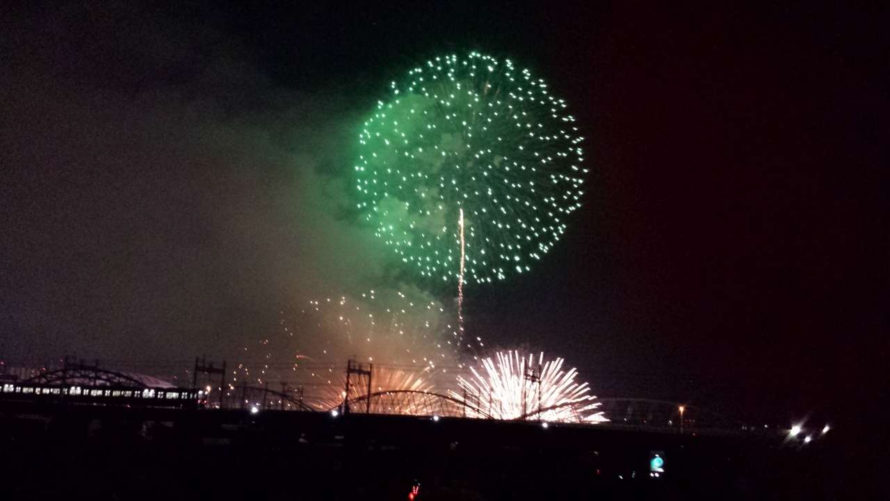 阪急十三駅から徒歩5分程の河川敷から見学できます。有料席もありますが、無料エリアでも十分楽しめます。屋台もたくさん出ていて楽しめます。