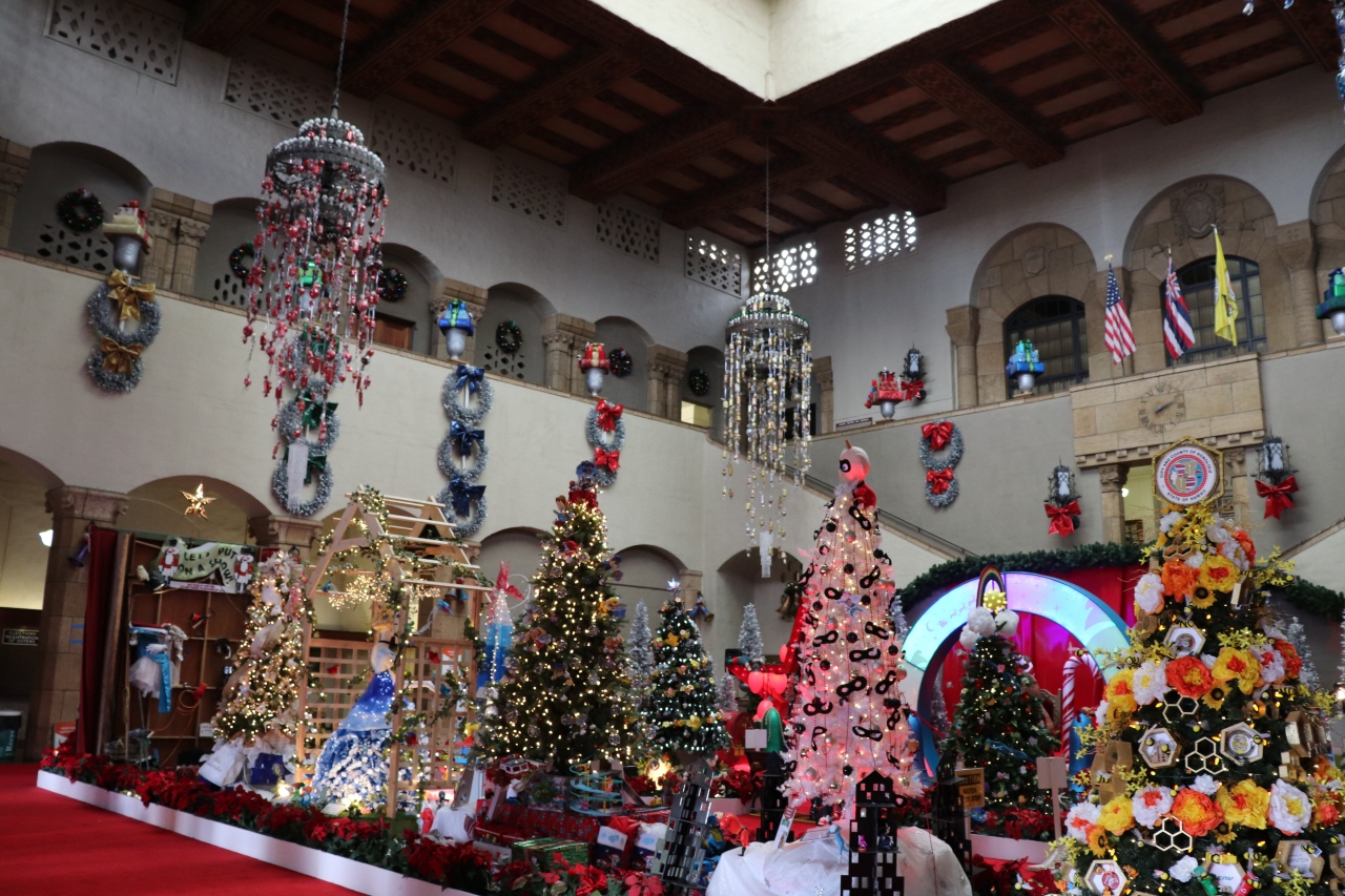 市庁舎の中にはたくさんのクリスマスツリーやリースのコンテスト作品が飾られています。