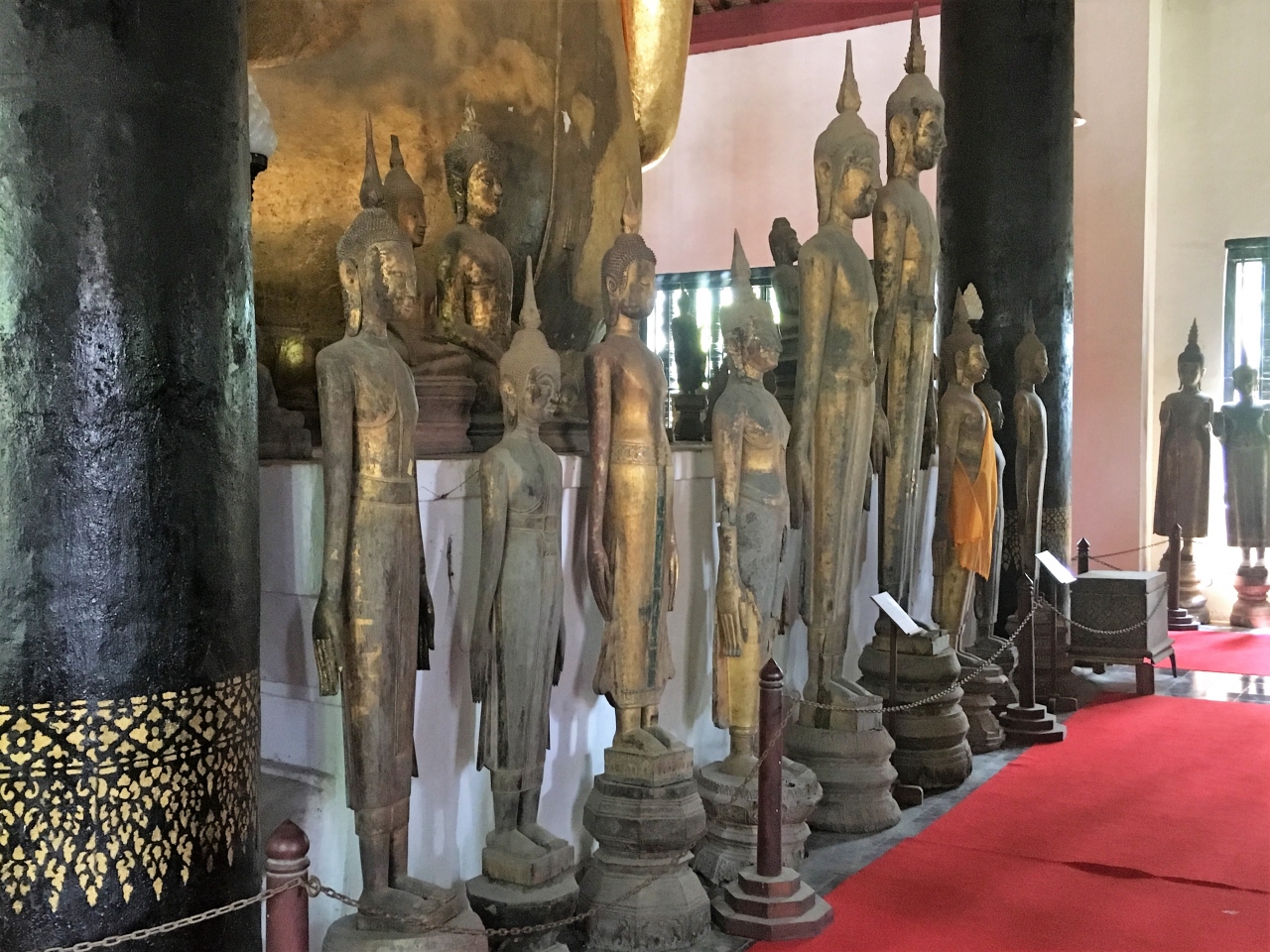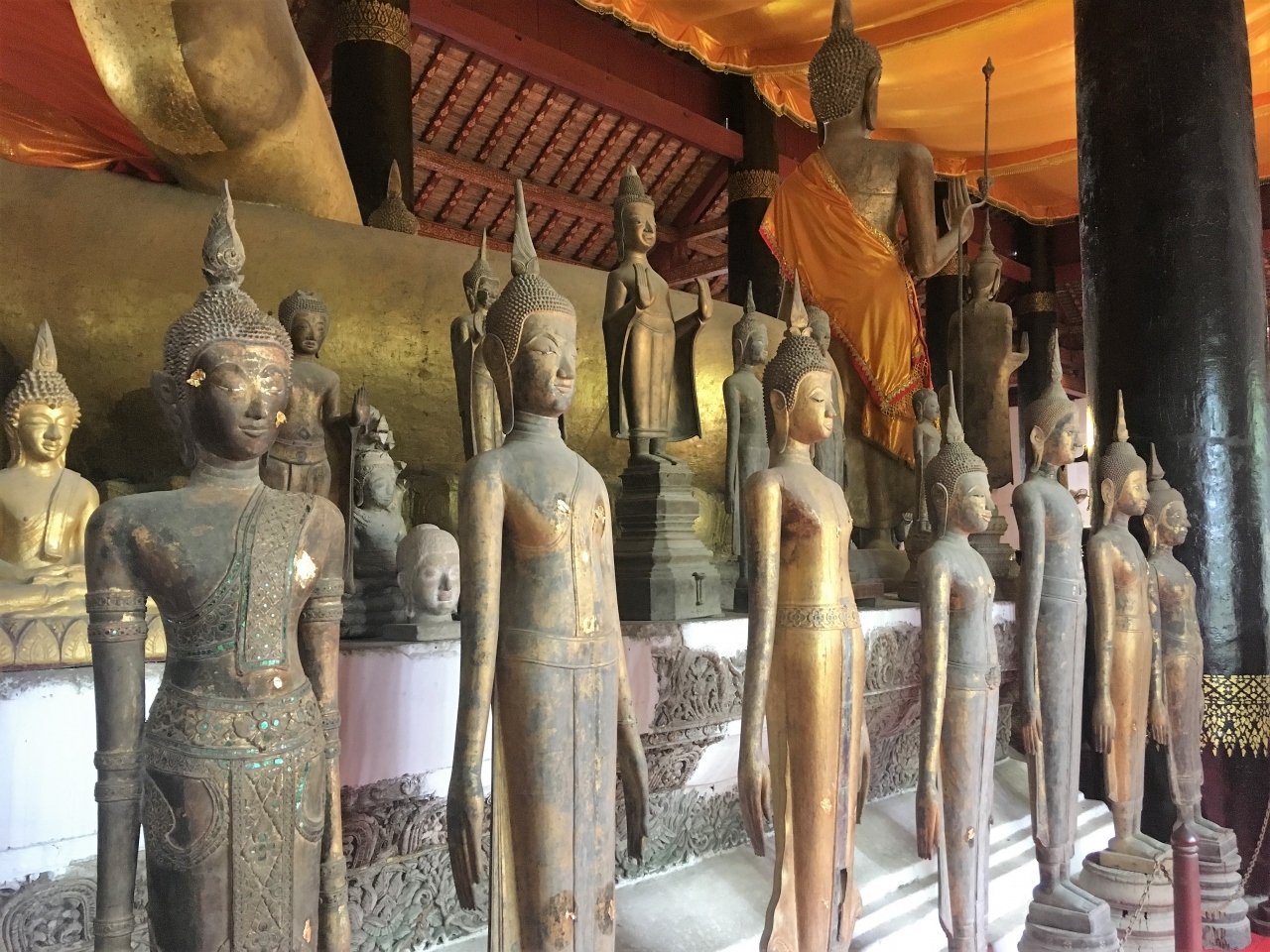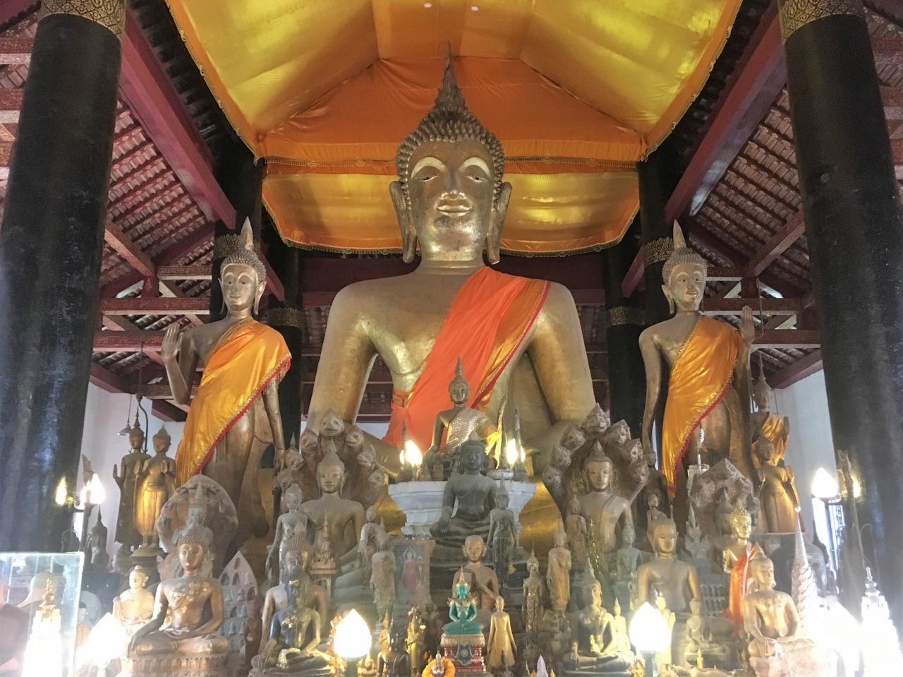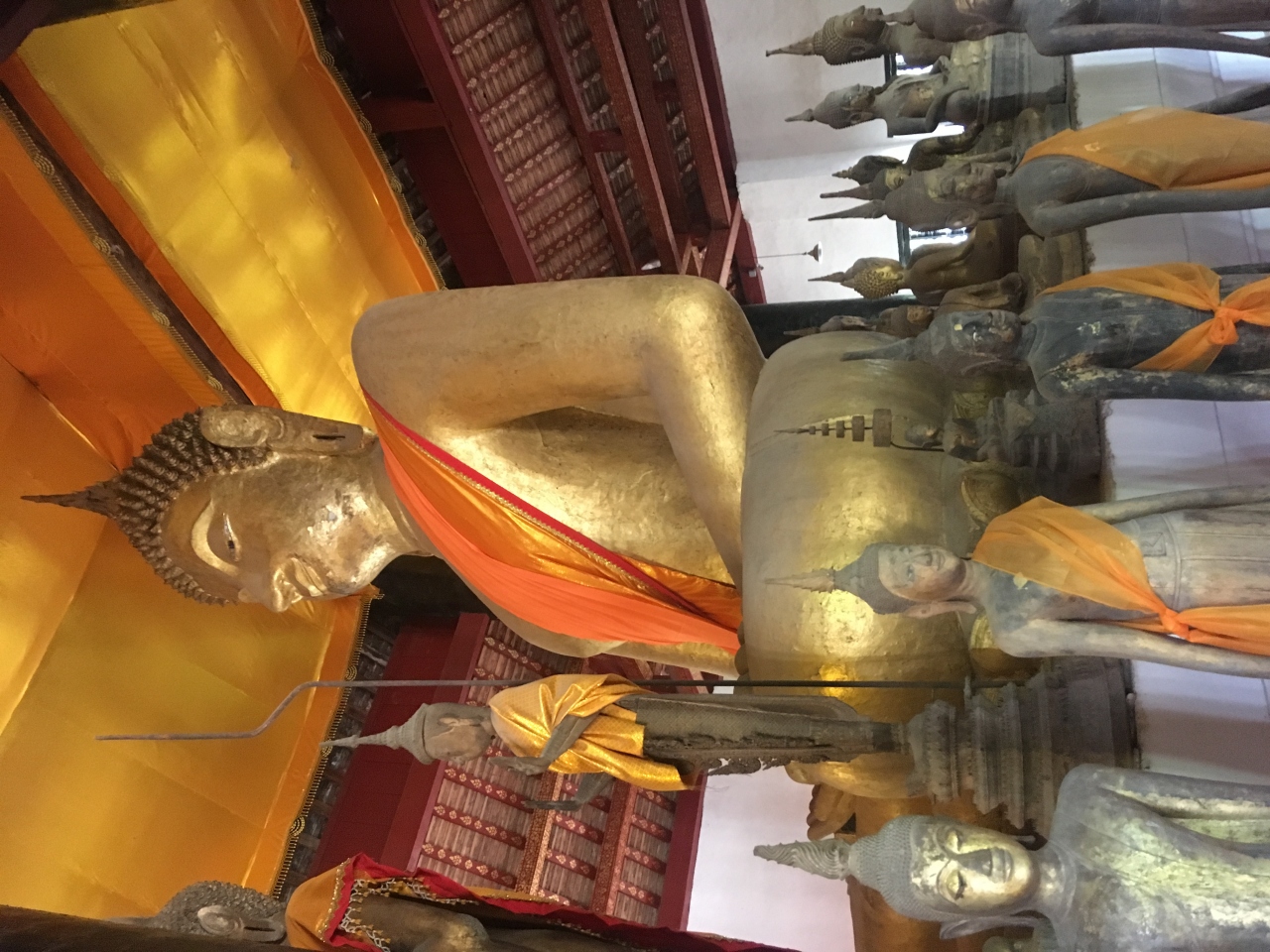 本堂に入ると、大きな柱と黄金のブッダ像が目に入ります。そして、まわりに多くの仏像が囲むように並んでいて、圧巻でした。- 旅行時期