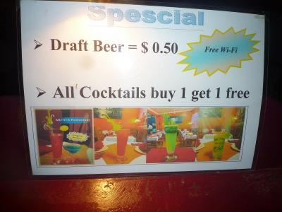 そんな通りにあるMUTITAレストラン。夕方6時ころに行ったのでハッピーアワーという事で、1ドルの生ビールが半額に。