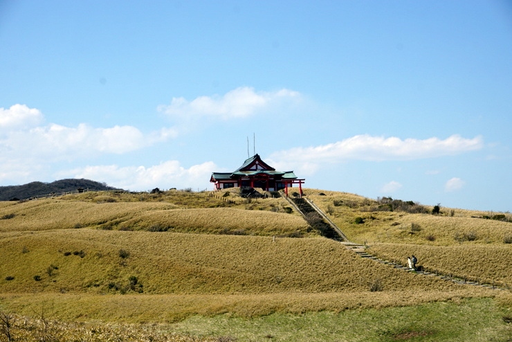 大室山は、お椀をふせたようなシルエットが特徴の山です。