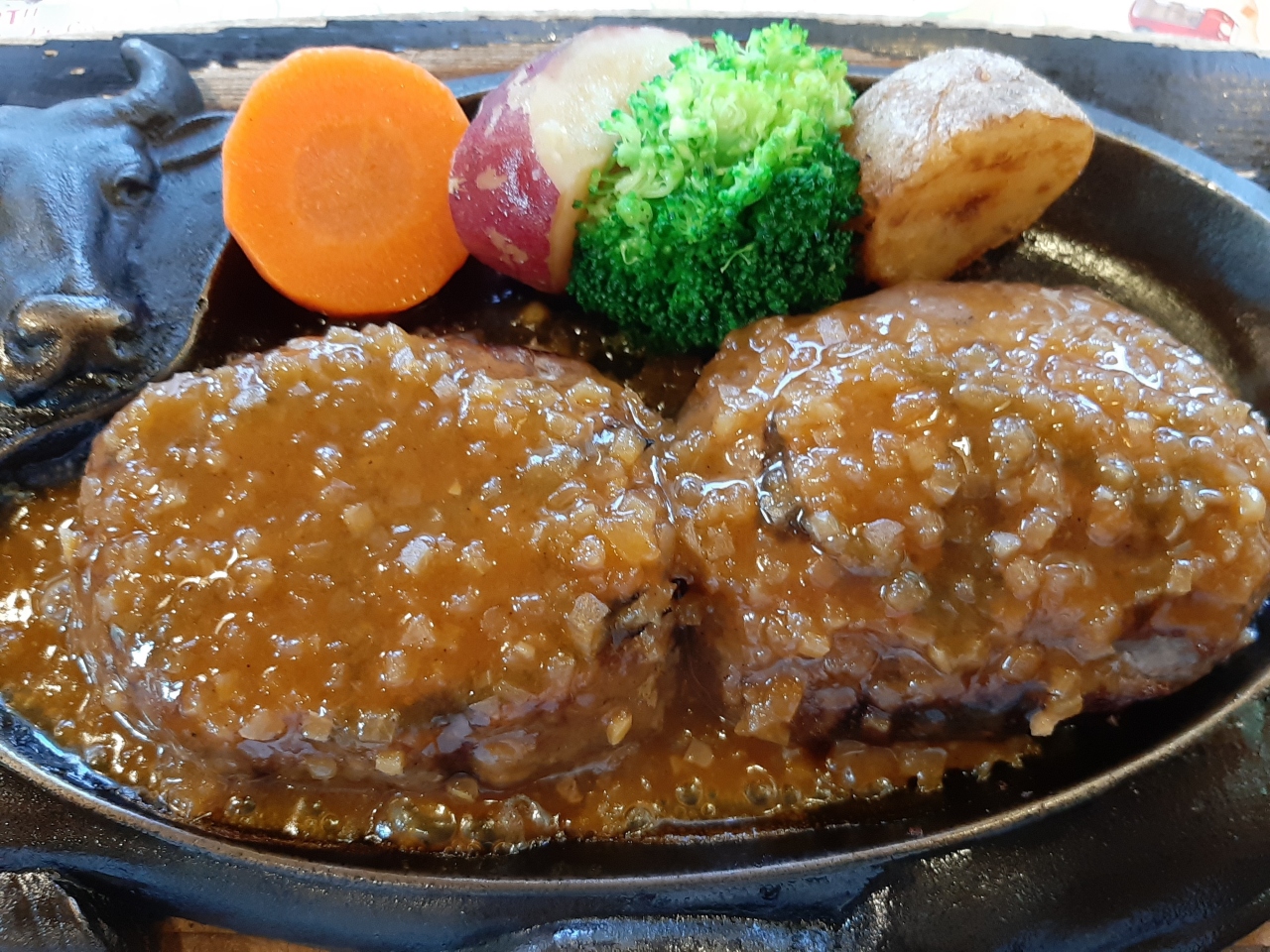 半分に切って鉄板に押し付けた後オニオンソースをかけてもらいます。