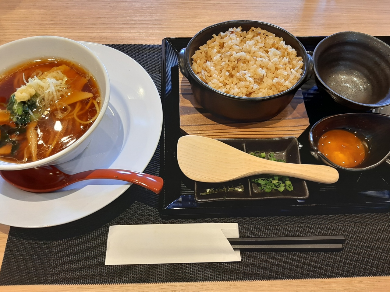 ご飯にはネギ、刻みのり、味付き卵黄が添えられていました。黄身を絡めて