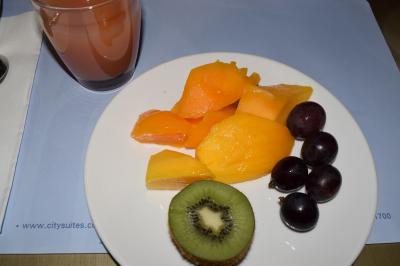 イチゴとマンゴーのソースがあったのでかけて食べることができます。