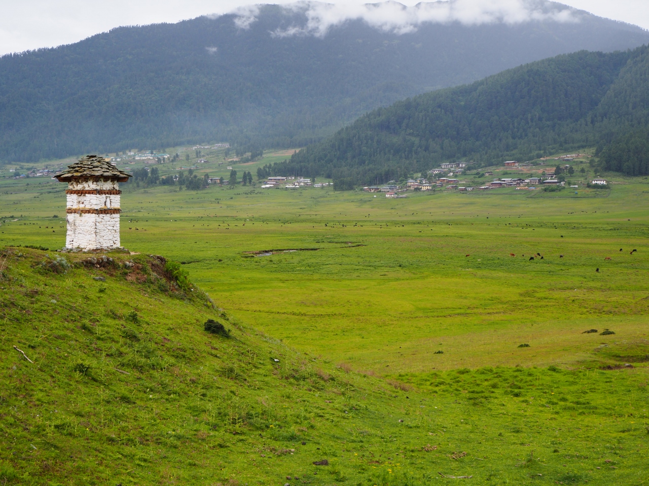 写真で見る以上に美しい「ガンテナチュラルトレッキングコース」。下のほうにある湿地帯からスタートしました。この付近はラムサール条約に指定されているエリアで、自然がよく守られています(ホテルがある付近はごみも目につきましたが。)広大な緑のエリアにウネウネの小川が流れ、牛が気ままに草をたべており、手つかずの自然そのもの。時々存在するチョルテン(仏塔)やルンタなどがブータンらしさを演出していました。通常50分ほどのハイキングになるそうですが、草花をじっくりみて楽しんだため、2時間もかかってしまいました。