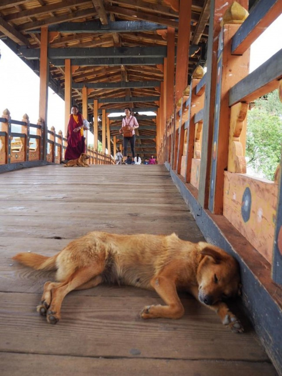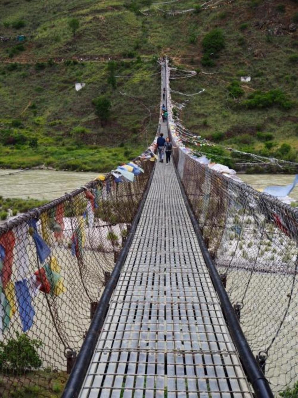 プナカゾンからほど近い、ポチュ(父川)にかかるブータン1長い吊り橋で、モチュ(母川)の合流点付近にあります。プナカは標高1300メートルで暖かく、駐車場からは自生するサボテンに囲まれた緩やかな坂を登っていきます。橋には観光客がたくさん。高さもあり川幅が広いため、マジでびびって数センチ単位でしか進めない人も(笑)。また生活道路として渡っている学生さんなどジモティの姿もありました。橋の両サイドには黒い管が。なんと水道管だとか。生活に必要な橋であることがわかります。そしてルンタ(五色の旗)もたくさん。事前に希望し、私もここにルンタをかけました。