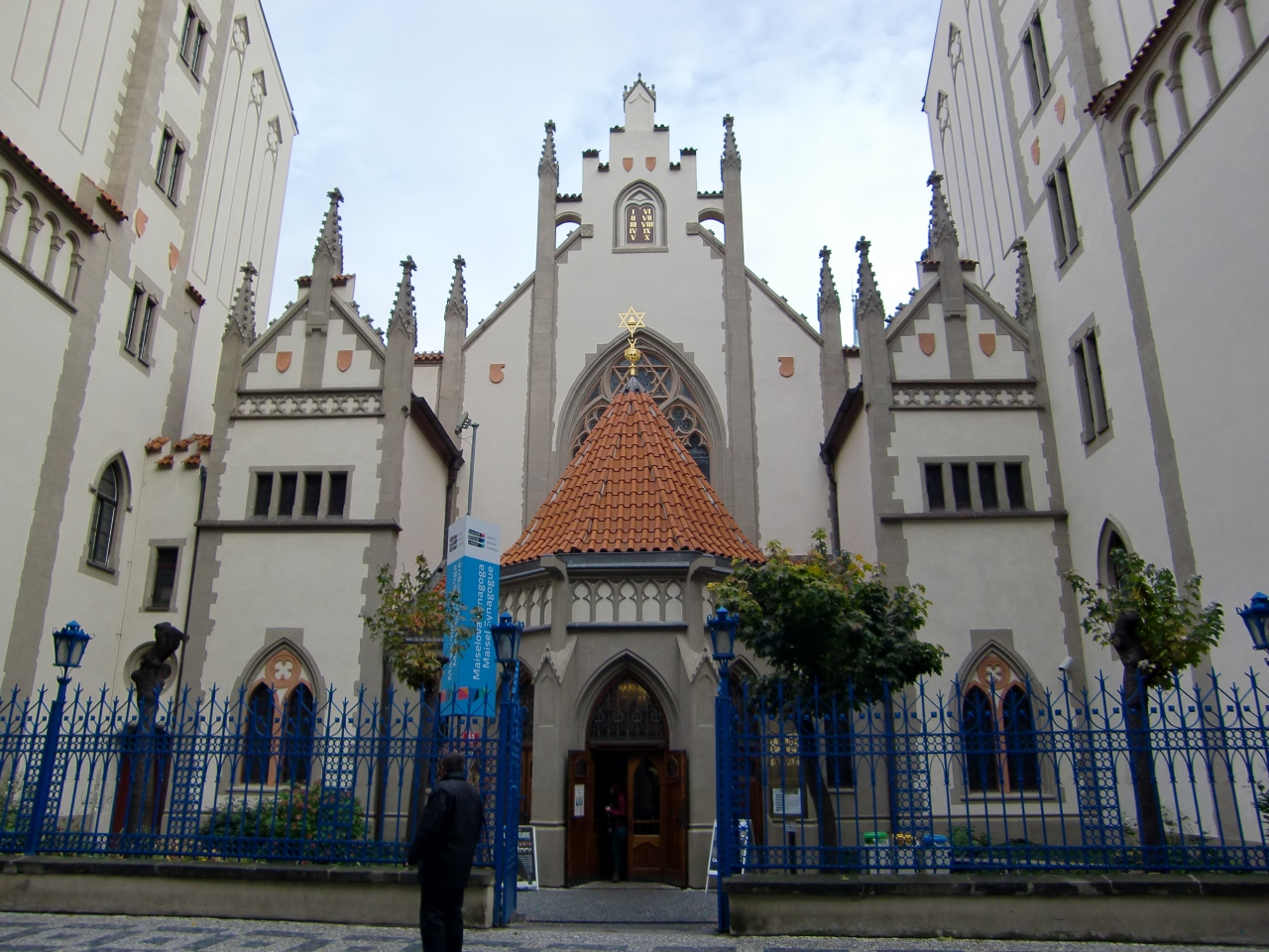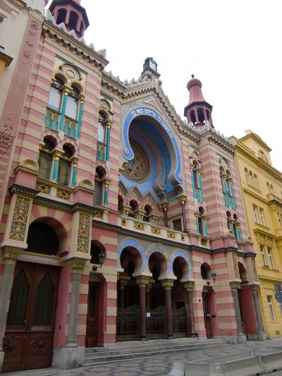 ユダヤ教地区から離れた、プラハ本駅前にあるシナゴーグ。外観は他のシナゴーグとは違いカラフル。1906年に建てられたプラハでは最も新しく、また大きなシナゴーグ。小さな細道に面しているため、全景を撮ろうと思ってもなかなか難しく、ほかの観光客も皆苦戦していました。