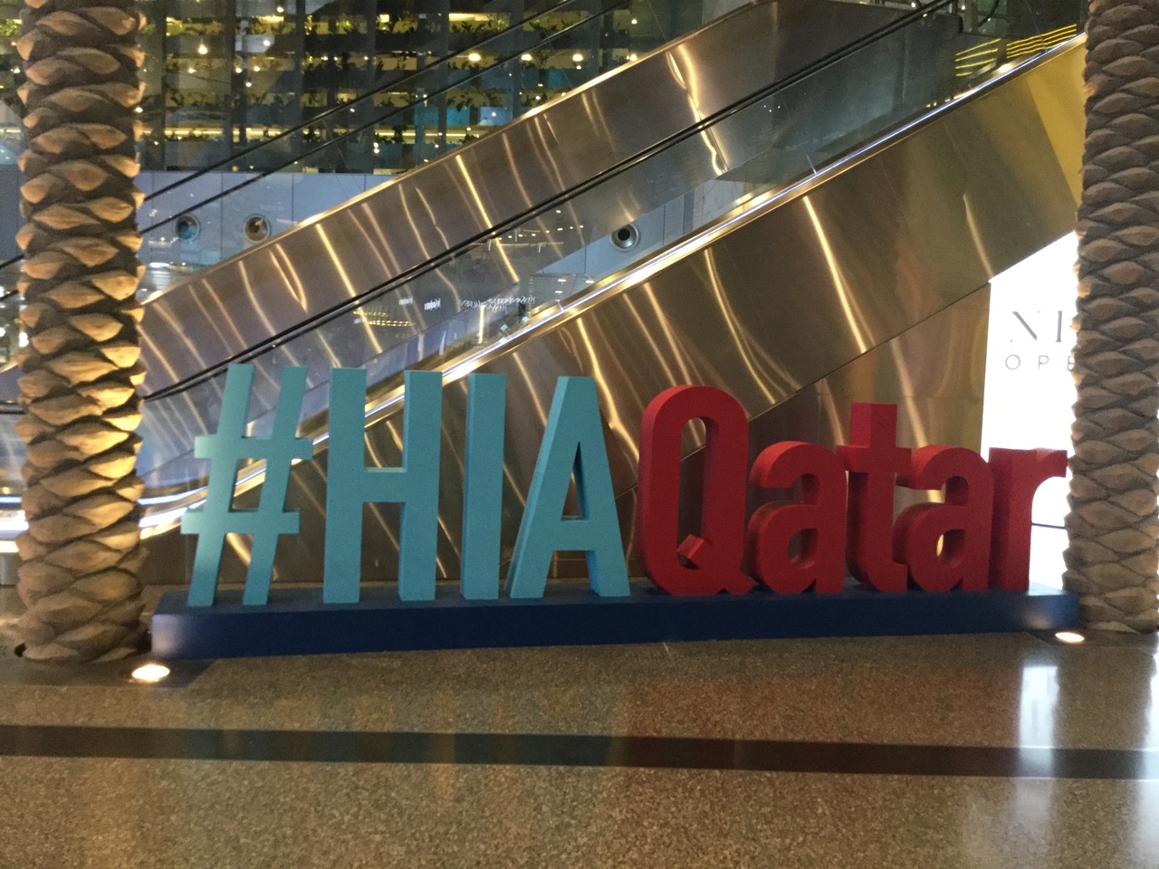 第1ターミナルでからカタール航空でドーハへ。ゲートへ行く途中、なにやらアートなスペースが。青い光の中に人影が動いています。よくよくみると、TOTOの文字が。まさかお手洗いだとは思いませんでした。中はちょっと迷路みたいになっています。