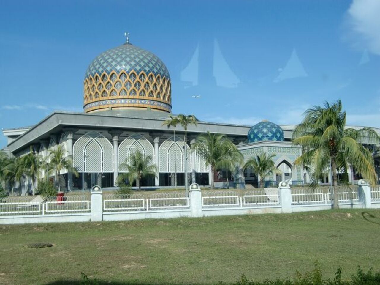 空港から市内へ行くエアポートバスが走り出すやいなや、空港周辺のなにもないエリアに突如姿を見せる美しいモスク「Masjid Sultan Abdul Samad KLIA」。トップのドームのモザイクが精巧で、青色が綺麗です。