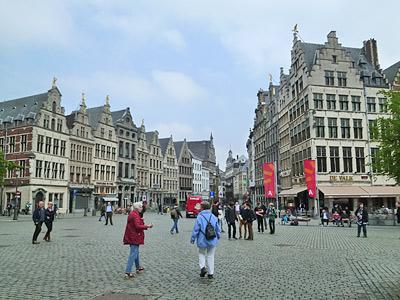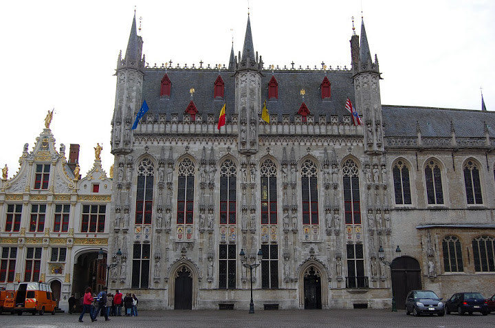「マルクト」は「市場(マーケット)」を意味しているそうです。広場の中心には2体の銅像が立っています。1302年の「黄金の拍車戦争」の指導者ヤン・ブレーデルとピーター・ド・コニングです。銅像の後ろには、切妻屋根が特徴的なかつてのギルドハウスが並んでいます。現在はオープンテラスのカフェやレストランとして利用されています。銅像に向かって右側には19世紀に建てられたネオ・ゴシック様式の州庁舎があります。