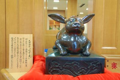 参集殿前にいる「なでうさぎ」は、撫でると手足の痛みをとってくれるといわれています。たくさんの人に撫でられて、ピカピカでした。