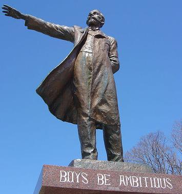 クラーク博士の「Boys be anbitious !」 は一般的に訳される「少年よ大志を抱け」という大げさな物ではなく続きにLike this old manとあって「こんなオッサンも頑張っているんだからオマエらも頑張れ」ぐらいの言葉だそうです。しかも実際に 「Boys be anbitious !」 と語ったとする文献はクラークが帰国してから17年も経ち、死後8年も経過した1894年に予科生徒・安東幾三郎が農学校の学芸会機関誌「恵林」に掲載した文章が最初だそうです。