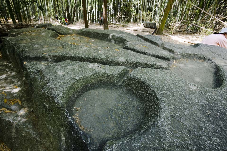 酒船石の使用目的については、まず製薬用に使用されたのであろうという説があります。古代中国の製薬、薬剤法は、ある薬の材料を配合するのに、それぞれを臼で搗いて粉末にし、これを各分量に応じて混ぜ、丸薬の場合は、白密(蜂蜜)で練るという行程を経ています。つまり、酒船石の円形凹所を、薬を搗くための石臼ではなかったかと考えているようです。