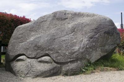 また別の説では、生贄台ではなかったかという説もあります。 これは、最上部の半月形の皿と主軸の溝の交わる所に後頭部を当てるようにして仰向けに寝てみると、腰から下が真ん中の小判形の中にすっぽりと落ち込み、そして両手を左右に大の字に伸ばすと、枝溝に腕がすっぽりと納まったまま手の平は左右の円形皿の中にきっちりと入るからです。