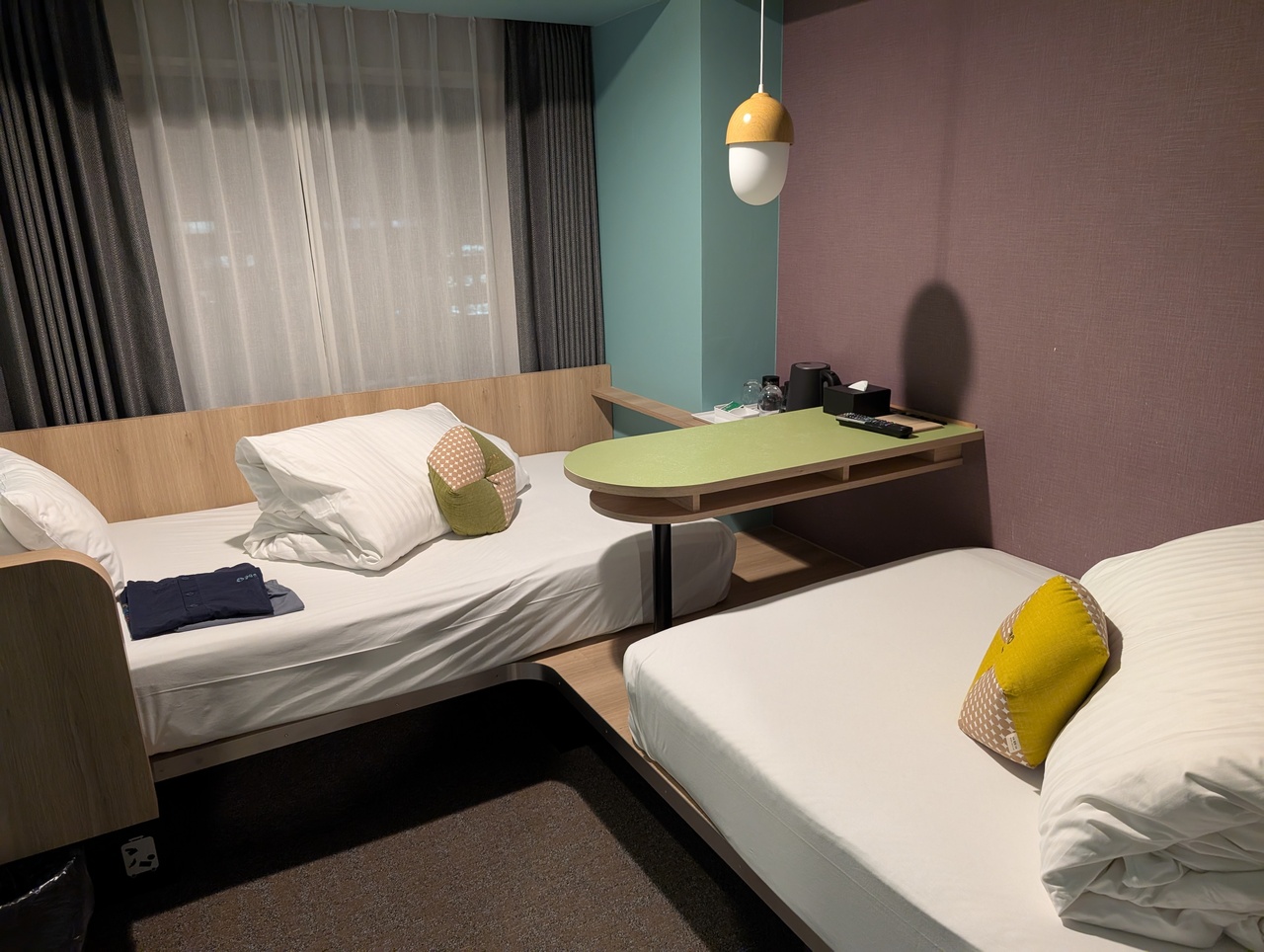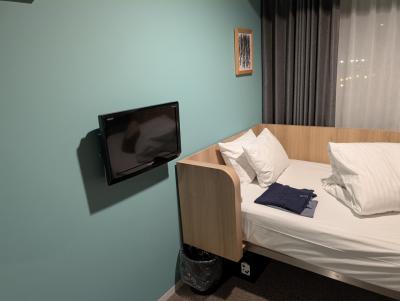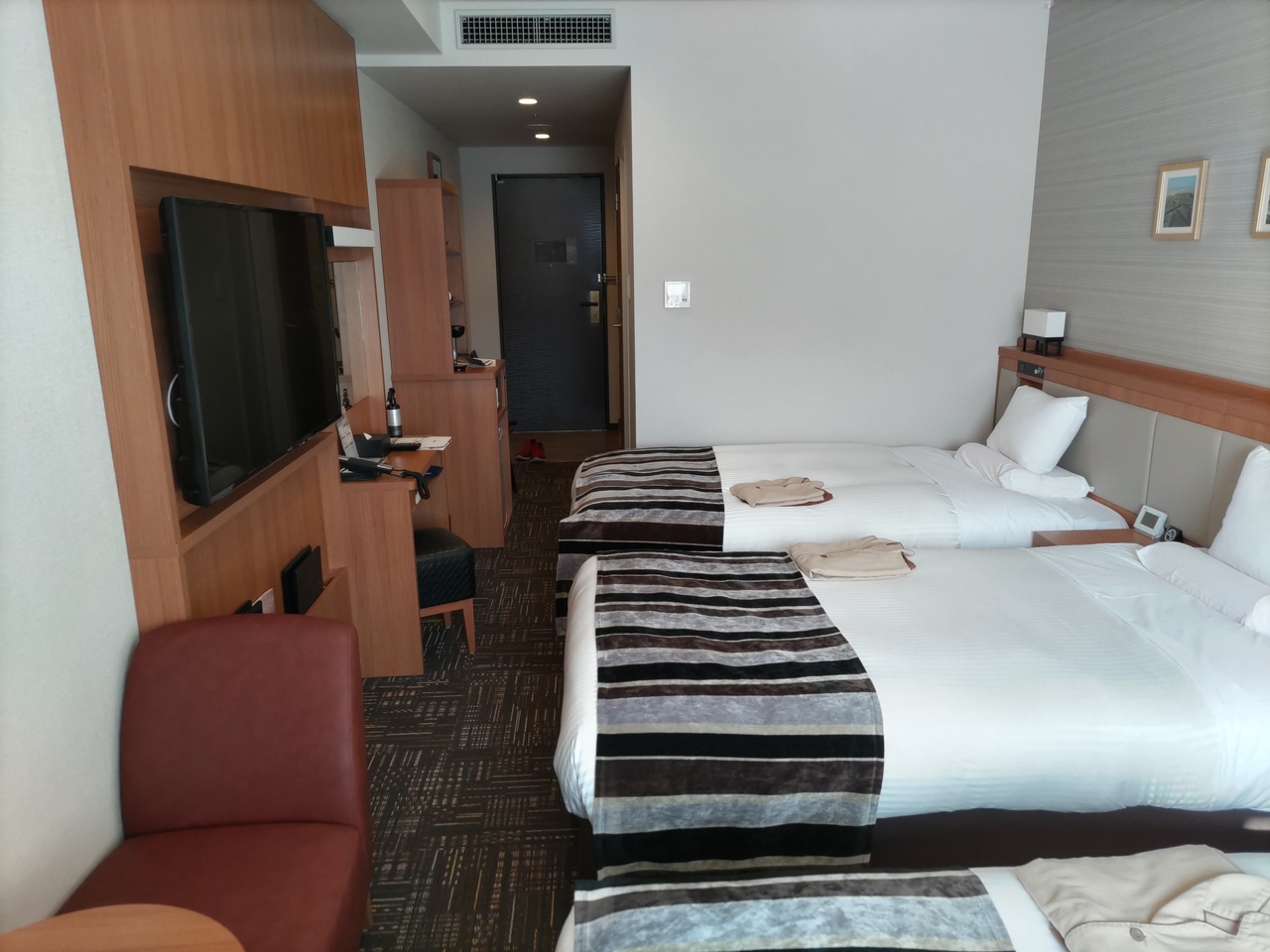 客室はベットの配置を工夫してツイン仕様になってます。コレはこれでアリかな。テレビは小さいです。
