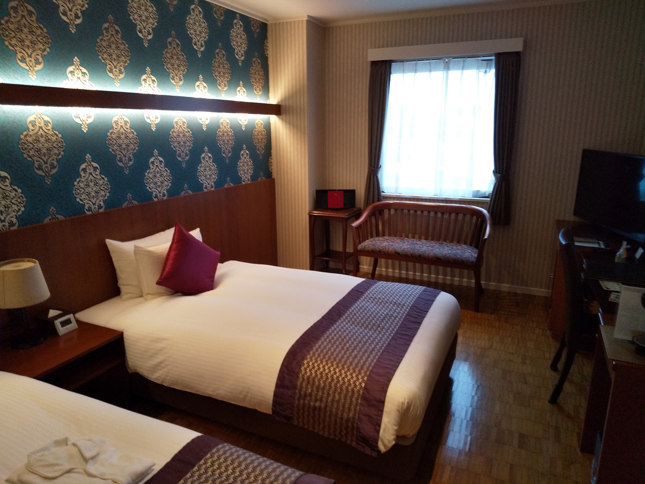 窓の眺望からは国会議事堂が拝める、都心のど真中にあるホテル。客室はアパらしいが、大画面TVやスマホ画面連動など、快適。