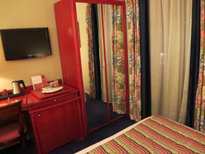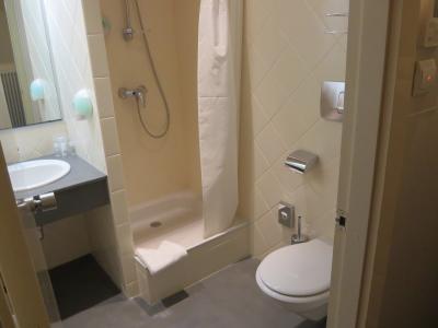 宿泊部屋は2階のダブルルームでシャワーのみの部屋。室内は一般的なシティホテルの広さで、館内設備も標準的です。窓はシャッター式のブラインドが完備の二十窓のため、トラム沿いの部屋でしたが騒音は気になりません。