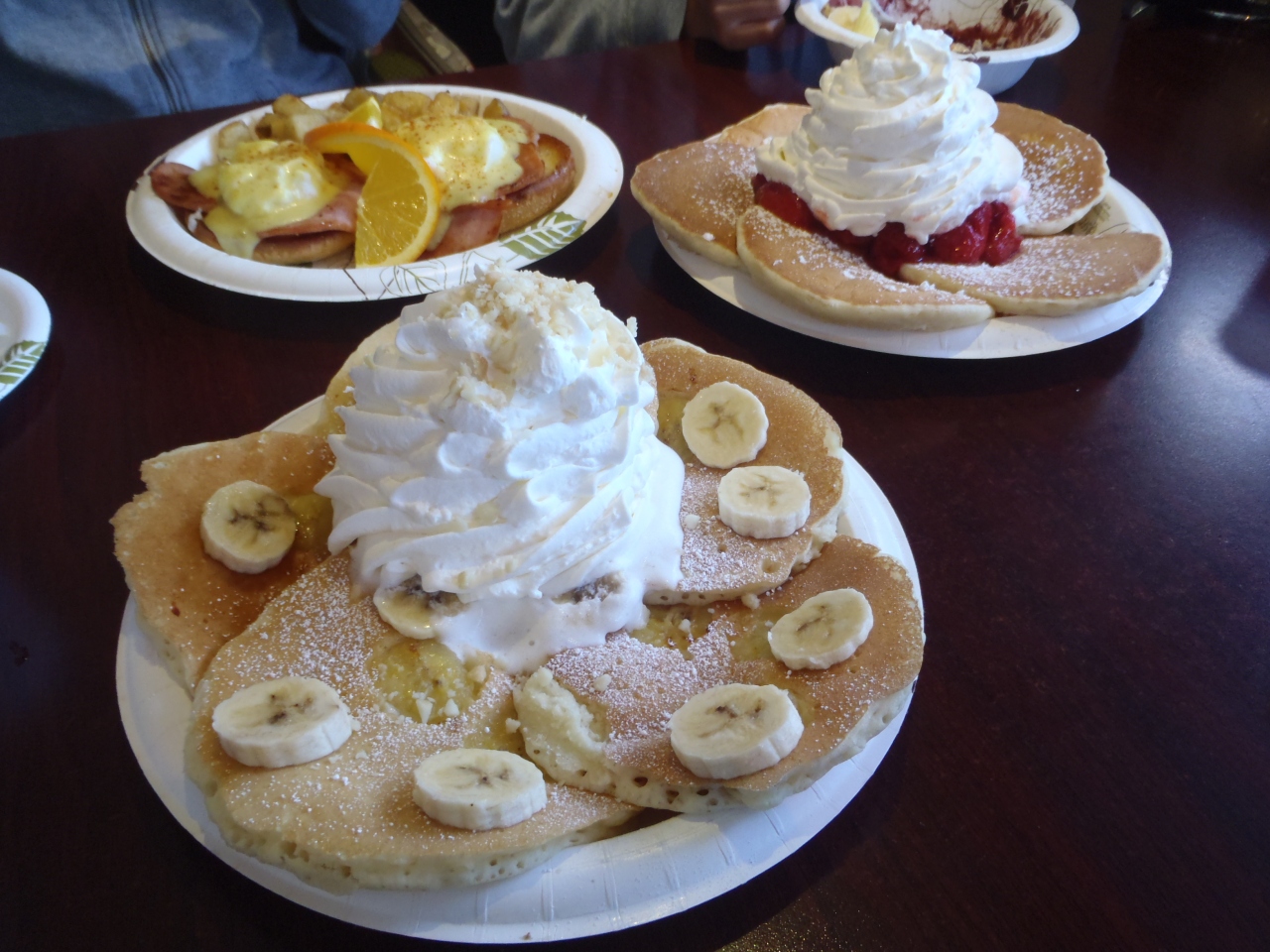 ホテルの近くだったので、朝食で使いました。行列覚悟で8時ごろに着くと、既に店の外まで列が出来ています。40分ほど並んで入店すると、運良く窓際の席に通されました。ビーチが見える最高の席です。店員は混雑に慣れており、手際よく対応している感じでした。注文すると、それほど待たずにパンケーキが出てきました。皿の中央にそびえ立つクリームの山。ハイビスカス(?)をイメージしているそうで、食べる前に写真を一枚。お目当てのパンケーキ($12.75)の他、エッグベネディクト($13.45)、アサイーボウル($7.45)も注文。個人的には、アサイーボウルを中心にパクついておりました。同行するメンバーによって、パンケーキを注文する数が違ってくると思います。我が家は4人家族のため、パンケーキ2皿で十分でした。