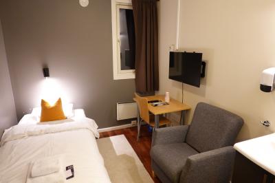 3.5トロムソのメインストリートからは徒歩5分程、同じ距離圏内にレストランやスーパーもあり。最安の部屋を予約するとバス・トイレは共用で部屋になし、部屋に洗面台はあり。...もっと見る
