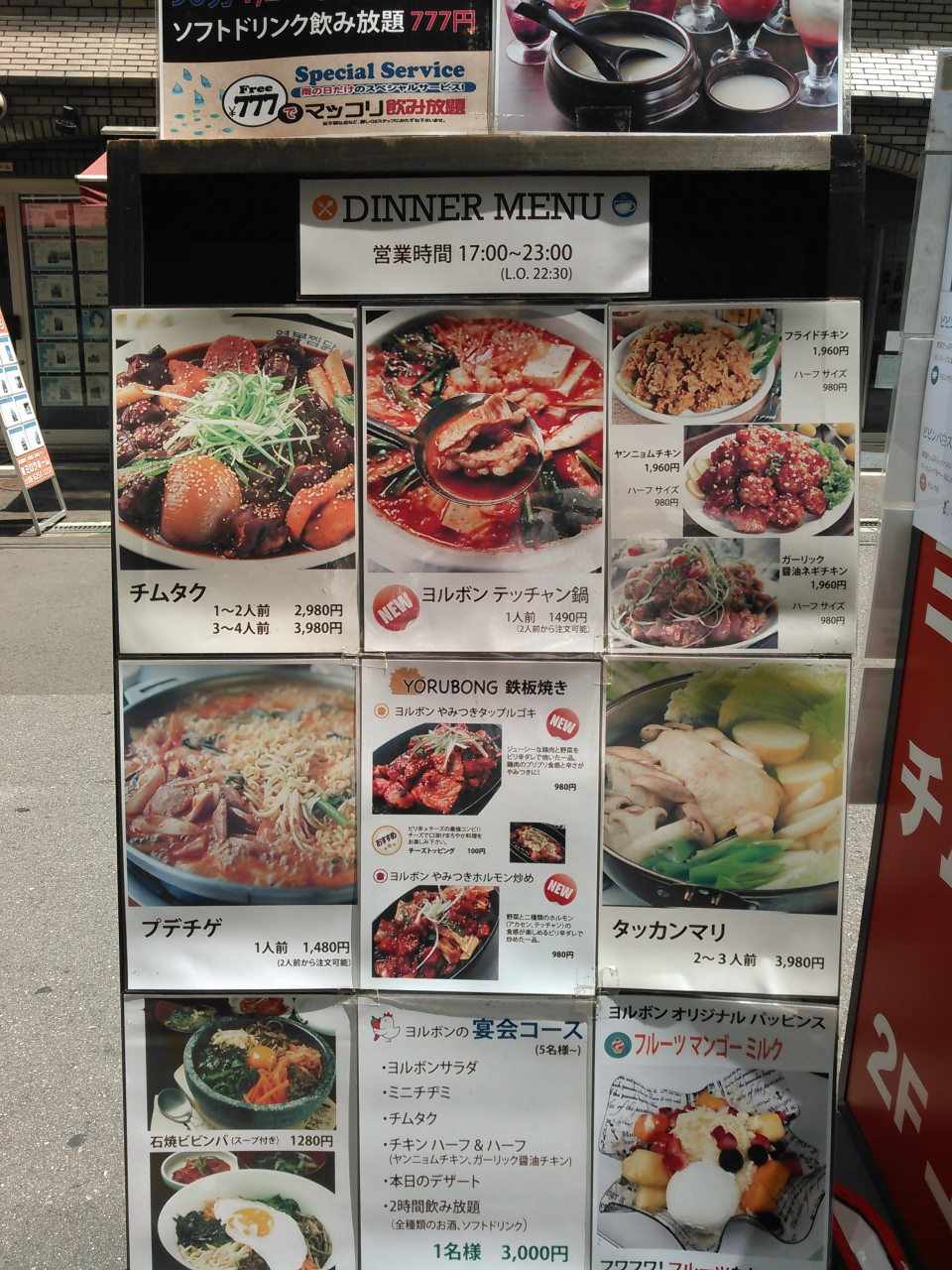 K-POPのSE7ENさんプロディースのお店です。韓国伝統料理のチムタク専門店です。チムタクとは鶏と、じゃがいも、春雨、トッポギなどを韓国の甘辛いしょうゆ味で仕上げた煮込み料理です。夜は大皿料理になってしまいますが、お昼の定食は小分けされていてお一人様でも十分楽しめます。必ずチゲがついてくるので夜に比べるとお得感があります。味のしみた鶏やじゃがいもがおいしかったです。別の日に夜も利用しましたが、ヤンニョムチキンなどもおいしかったです。ただ、キムチはいまいちでした。店員さんも皆さん明るく元気で印象はよかったです。