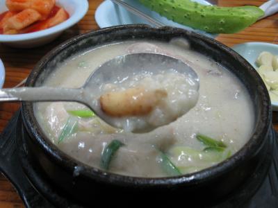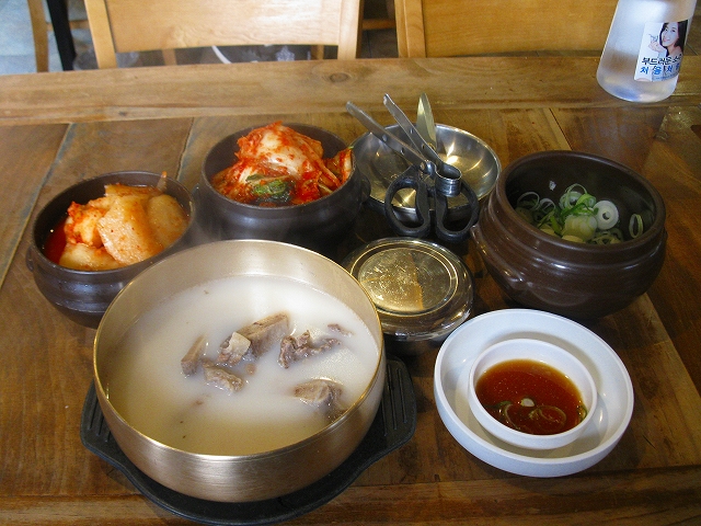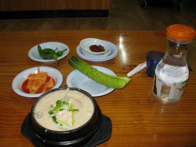ここの参鶏湯の特徴はなんといっても、クリーミーなスープです。鶏からとったスープにすりつぶしたエゴマが入っているそうです。サイズは他のお店より少し小さめですが、スープが濃厚なのでけっこうお腹に残ります。少し味がだれてきたら、付け合わせのまるごときゅうりを一口食べればさっぱりします。薬味の野菜はセルフでおかわり自由です。