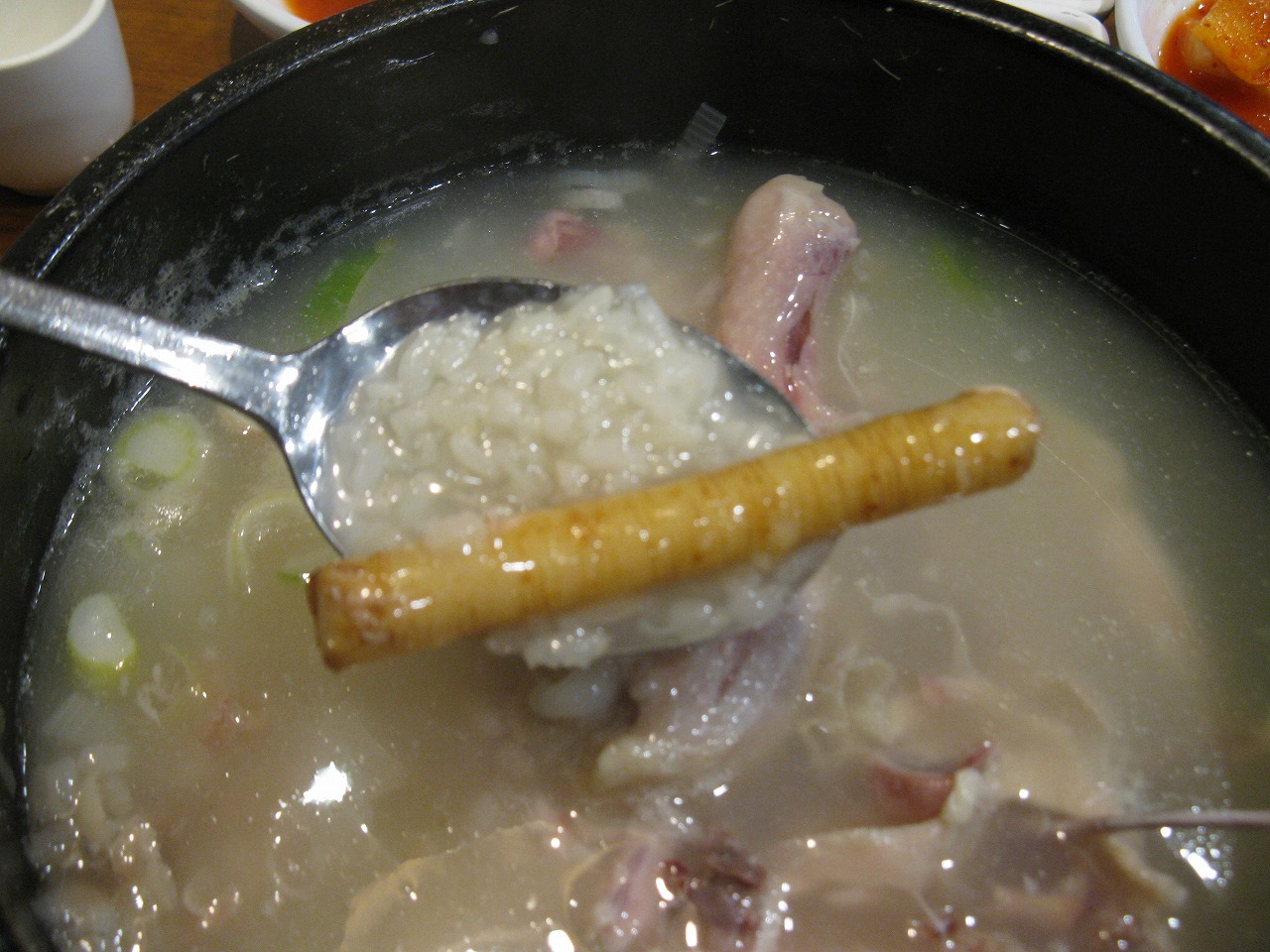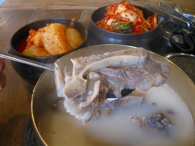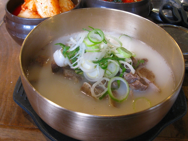 白濁したスープがとっても美味しかったです。スープには味をつけていないようなので、お好みで塩や胡椒を加えます。慣れないと塩を入れすぎでしょっぱくなるので気をつけて下さい。味見をしつつ塩を加えるとは、すなわち大阪でいう串カツの「ソースの二度付けお断り」問題が浮上しますが、知恵を働かせるか、我慢するかでのりきって下さい。今回はカルビタン(W14,000)を注文しました。ソルロンタンだけでは物足りない方にお勧めです。汁系のお店はキムチが美味しいです。特にここのカクテキは絶品でした。お店の壁に「キムチはお召し上がりになる分だけお切りください」との張り紙がしてありました。