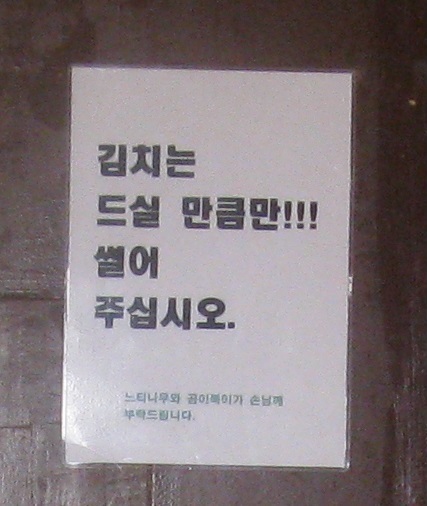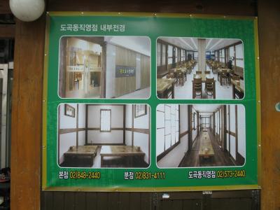 料理は美味しかったのに、接客の悪さには閉口します。席につくと面倒くさそうに無言でメニューを置かれ(渡されたのではなく)、まさかの放置状態。待てども待てども。「エクスキューズミー」ではなく「チョギヨ」といって注文するも「ネェ(はい」の言葉もなくこれまた無言で給仕。こちらが外国人だからなのか、日本人だからなのか、ただ単に虫の居所が悪かったのか。いっそ店の前に「外国人お断り」だの「日本人お断り」だの書いていてくれれば、こちらも気分を害することもなかったのに。いやぁ、それが韓国ですよって声が聞こえてきそうですが、それにしても・・・。韓国6回目にして初のアジュンマ洗礼を受けました。