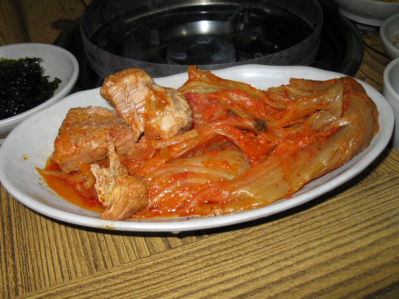 お一人様で韓国を旅行すると大皿メニューは注文しにくいですが、こちらでは1人前から美味しいキムチチムがいただけます。キムチチムとは古漬けのキムチと豚肉を煮たお料理です。
