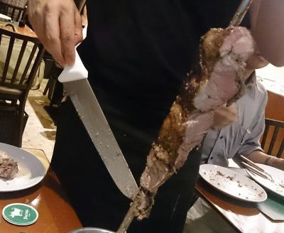 シュラスコはテーブルに焼きたてのサーロインやチキン、羊肉などを持ってきてくれて、目の前でカットしてもらった分をいただきました。