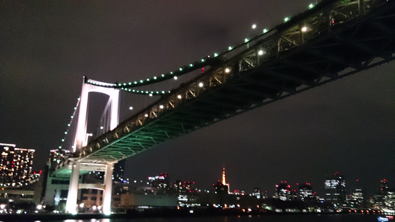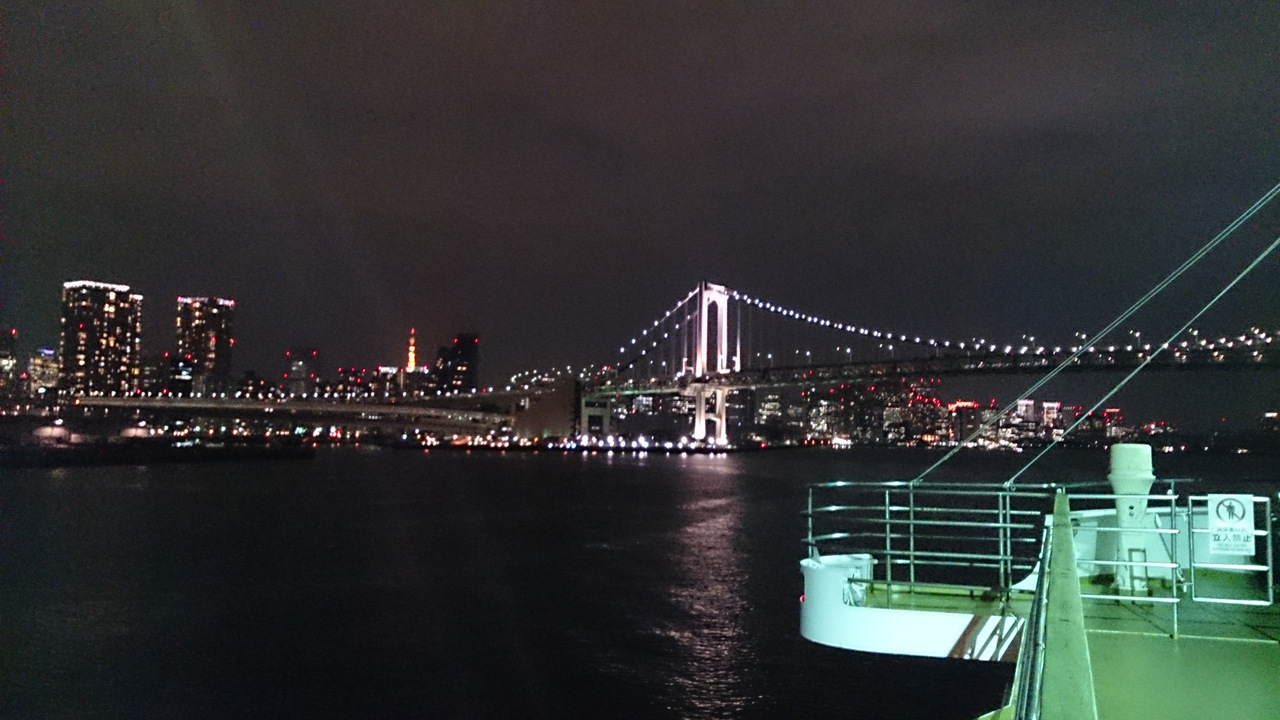冬だとデッキに出るのは寒いですが、キラキラしているレインボーブリッジを下から眺められるのはめったにないことなので必見。