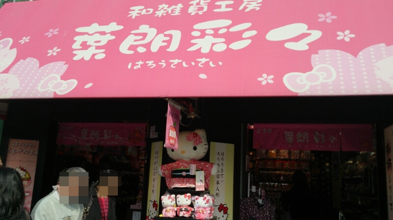 店頭に着物を着たキティちゃんの人形があり、大きいのでとても目立ちます。