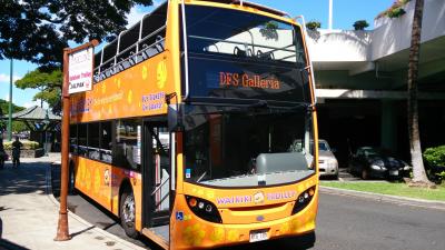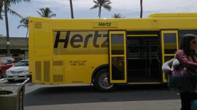 ホノルル空港の出口を出て、信号を一つ渡るとハーツレンタカーの黄色いバスが走っているので、合図をして乗り込みました。