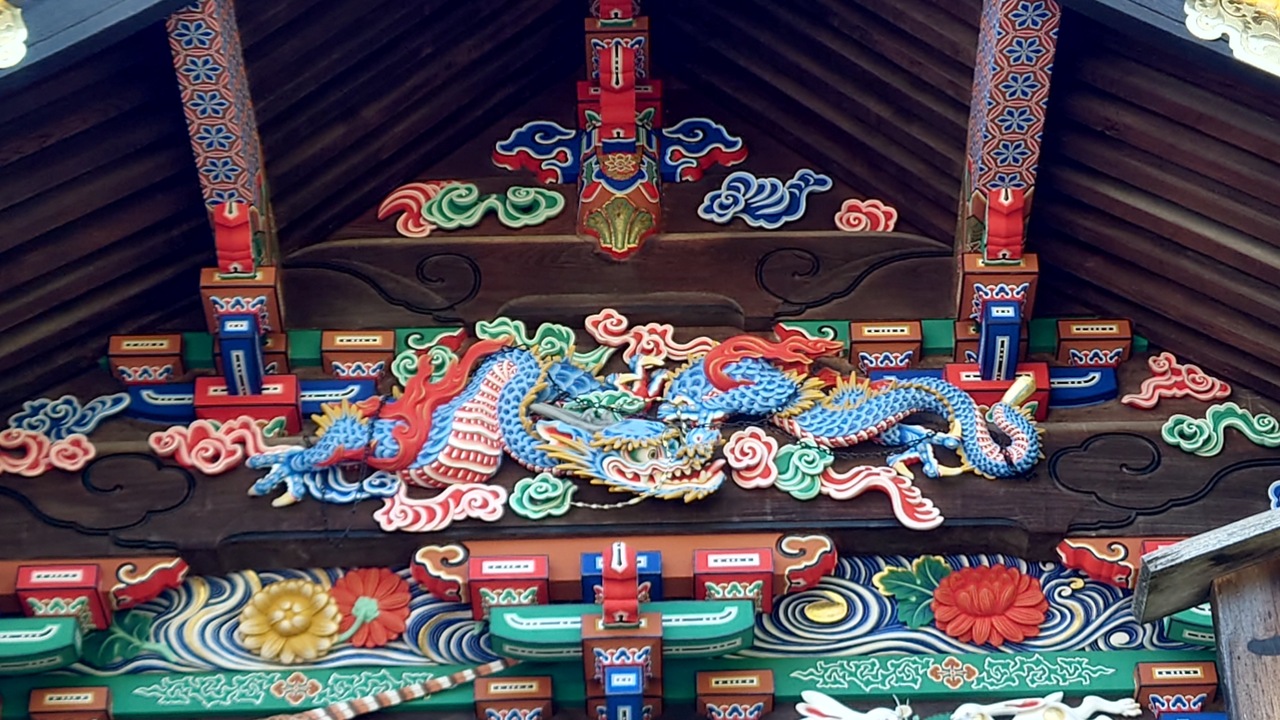 青い龍の彫刻が見事で、みなぎるパワーを感じました。