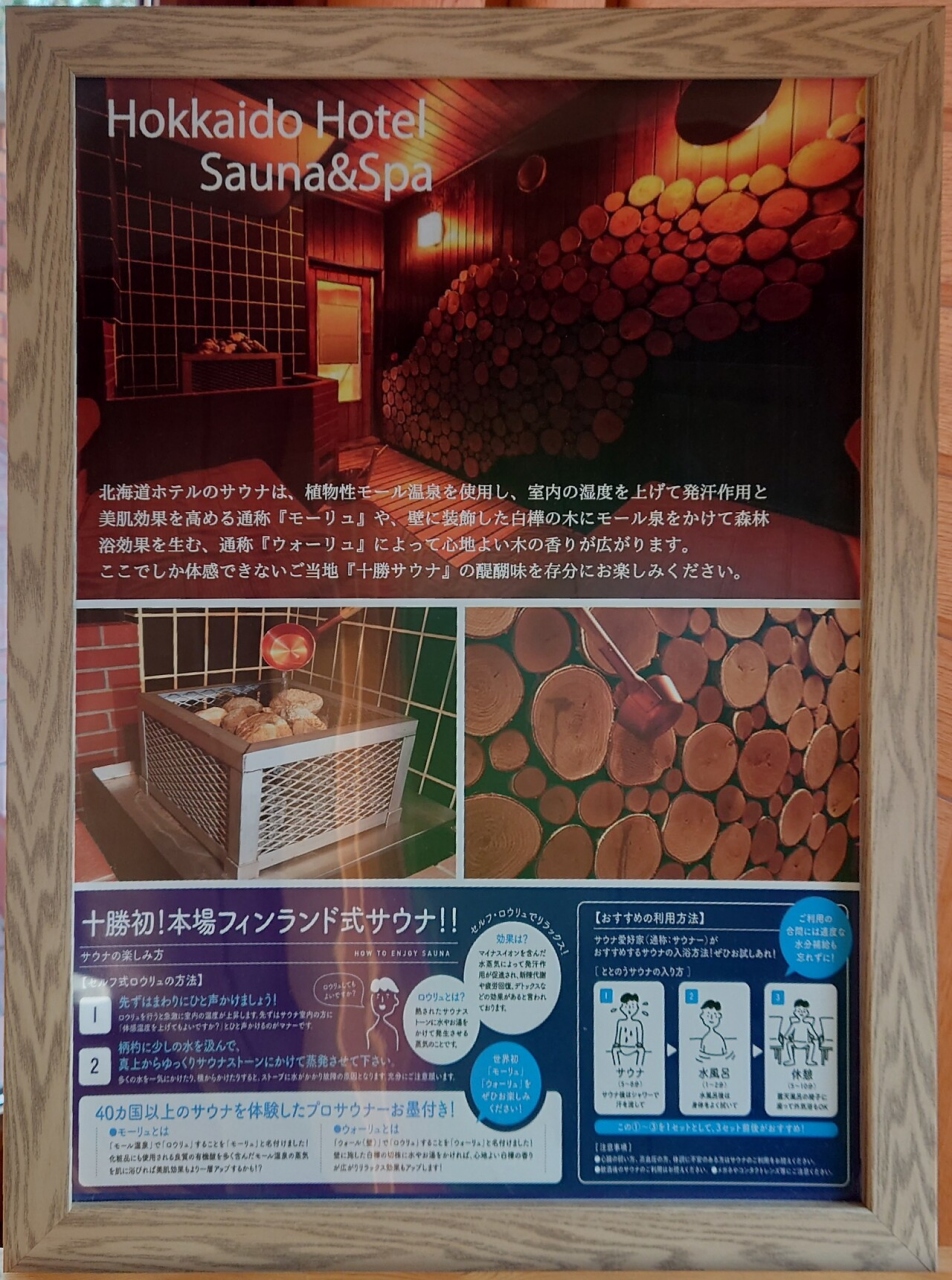 北海道ホテルは希少なモール温泉に入れることと、セルフロウリュウ&ウォーリュウ(壁の木にロウリュウをかける)が有名です。