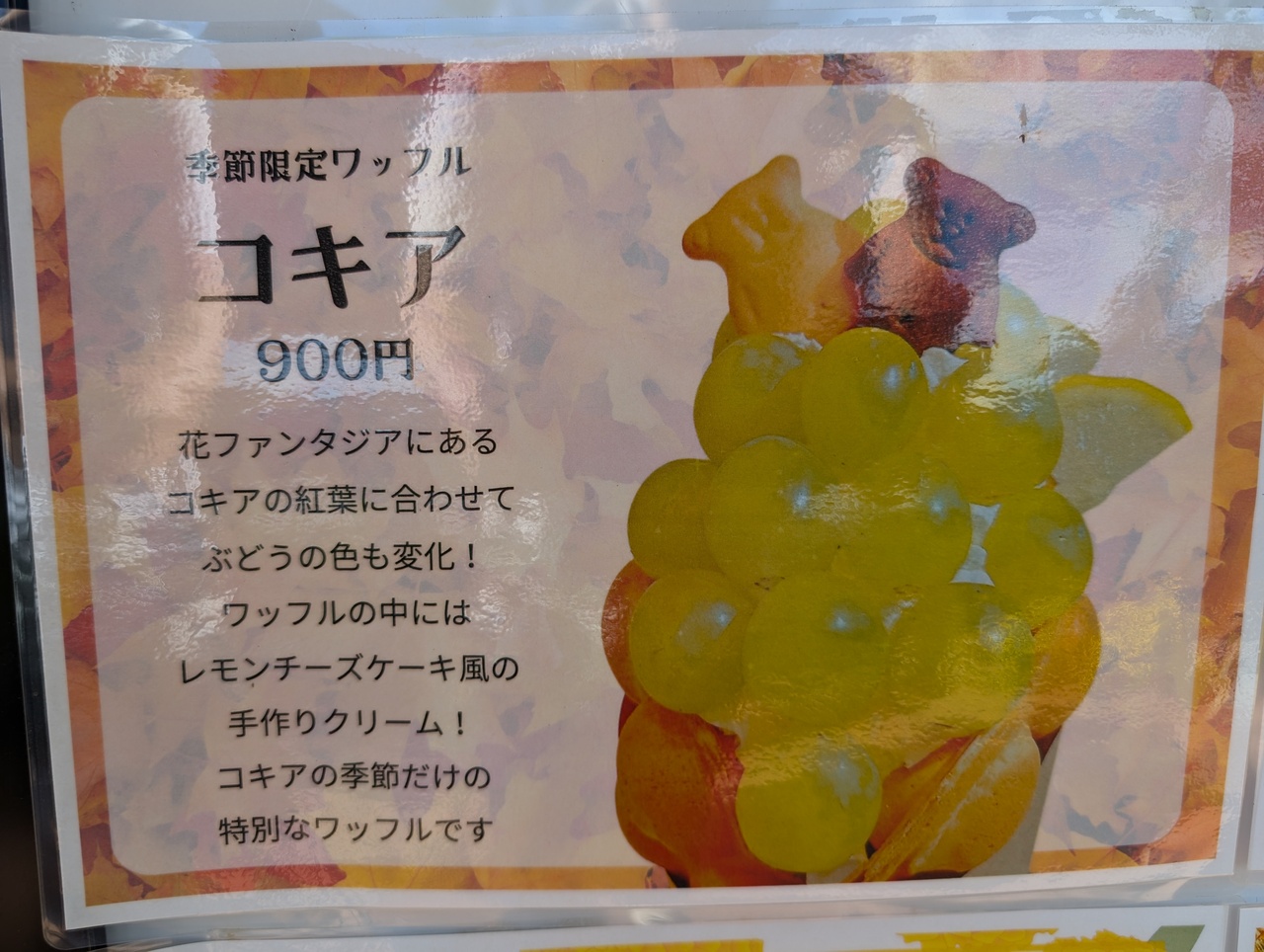 期間限定のおばけサンデーとコキアを食べました。コキアと名前のついたスイーツは、園内のコキアの色に合わせてぶどうも赤っぽくなっていました。