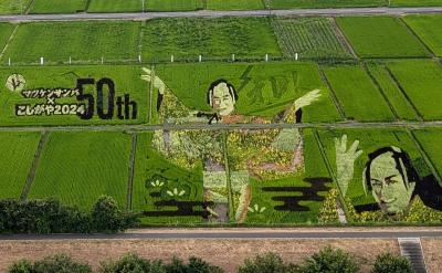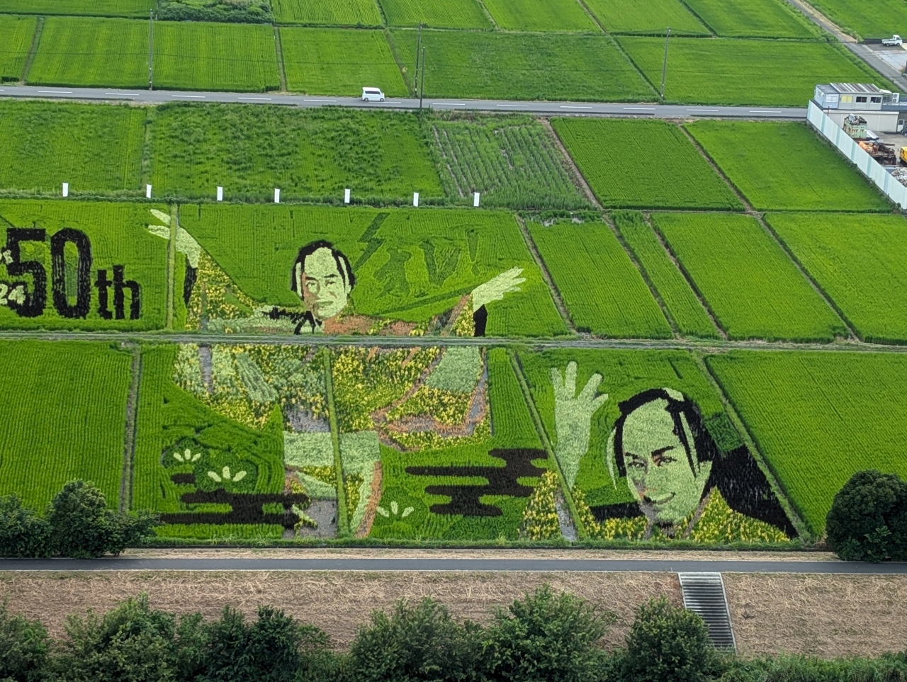 田んぼアートの近くのリユース展望台から全体を見ることができます。