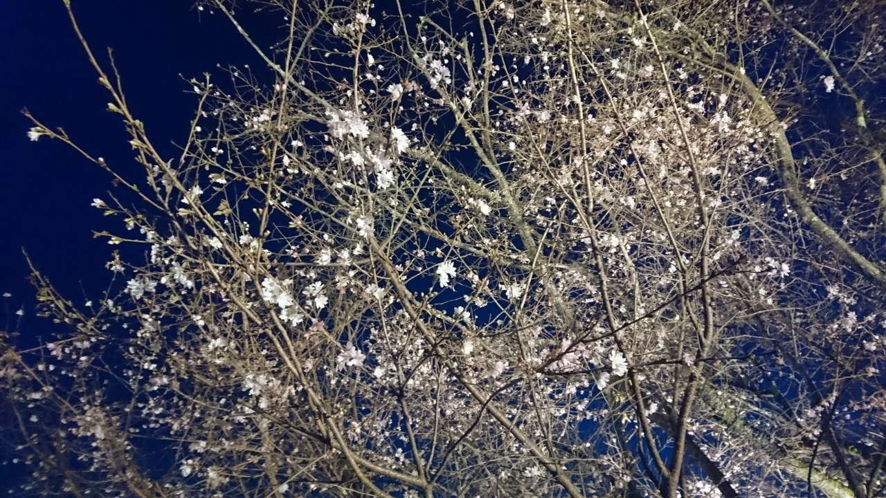 この年の冬桜は二分咲き~三分咲きくらいで見頃はこれからという感じでしたが、ライトアップされた冬桜はうっすらピンク色に見えてきれいでした。