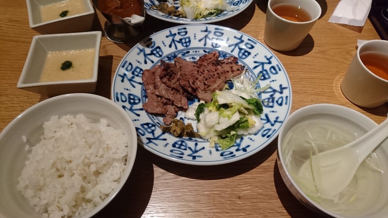 牛タンのお皿にとろろ、麦飯、テールスープが付いてきます。